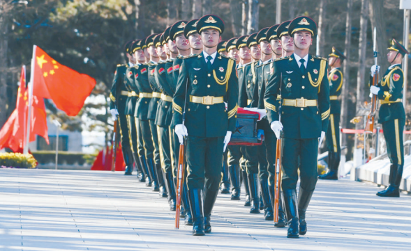 全体人员向志愿军烈士三鞠躬,27名部队官兵鸣枪12响,向英烈致以崇高敬意。《思念曲》再次低回奏响,礼兵们抬起志愿军烈士棺椁,绕广场半周,缓缓走向安葬地宫。自2014年以来,我国连续10年以隆重礼仪迎接总计938位志愿军烈士遗骸归国安葬,让他们回到祖国的怀抱。