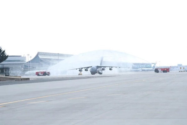 11月23日上午,空军专机运-20降落在辽宁沈阳桃仙国际机场。沈阳桃仙机场以“过水门”航空最高礼仪迎接志愿军烈士回家。曹舒昊 摄