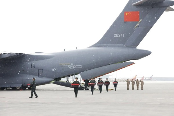 北京时间上午9时,中韩双方在韩国仁川国际机场举行志愿军烈士遗骸交接仪式。上午11时32分,空军专机运-20缓缓降落在辽宁沈阳桃仙国际机场。专机进入中国领空后,空军两架歼-20战斗机护航,并在沈阳机场上空通场,“双20”同框向志愿军烈士致以崇高敬意,沈阳桃仙机场以“过水门”航空最高礼仪迎接志愿军烈士回家。